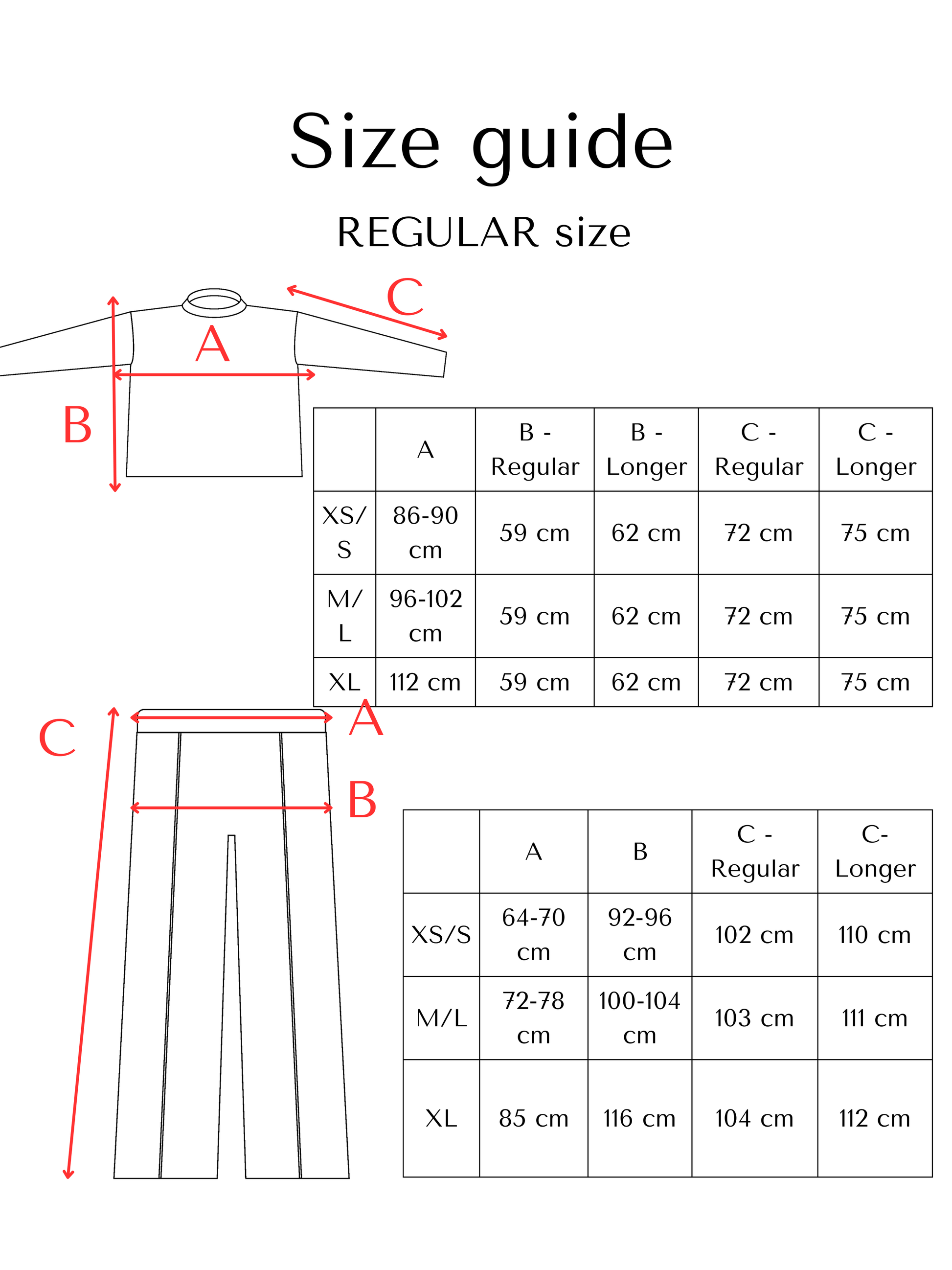 - XL (EUR42/UK14) – Krūtinė – 56 cm | Ilgis – 66 cm | Rankovė - 63 cm