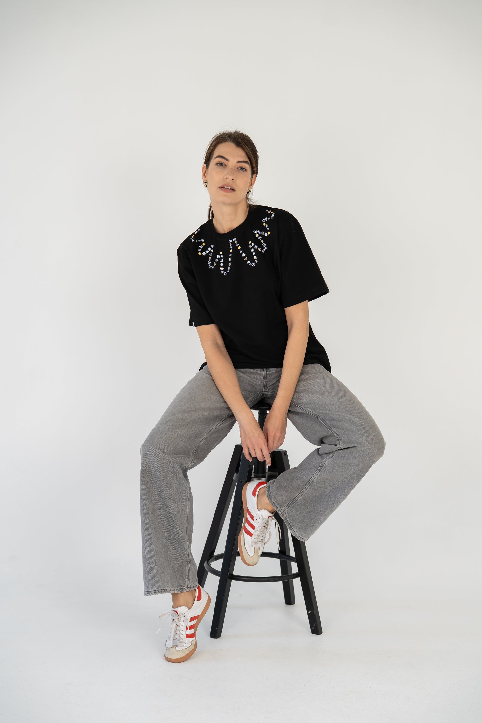 Oversized tipo marškinėliai (dydis S atitinka M) su kuriais jausitės ypač patogiai ir laisvai.