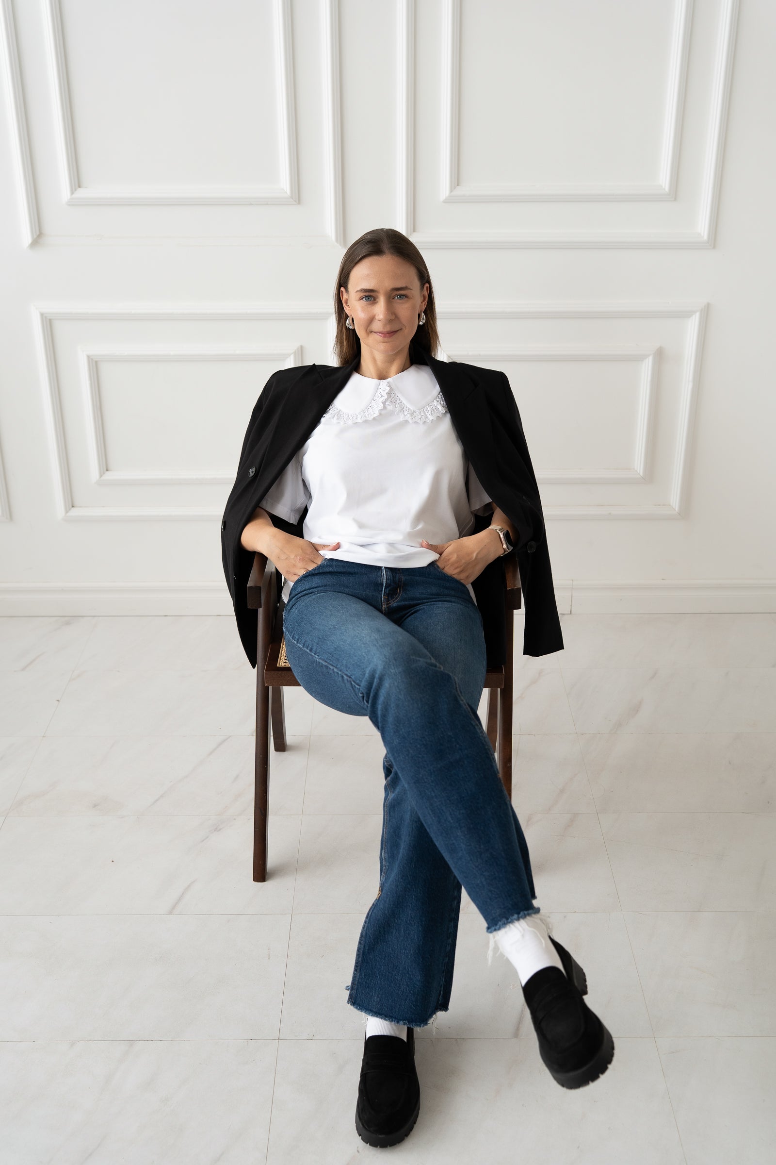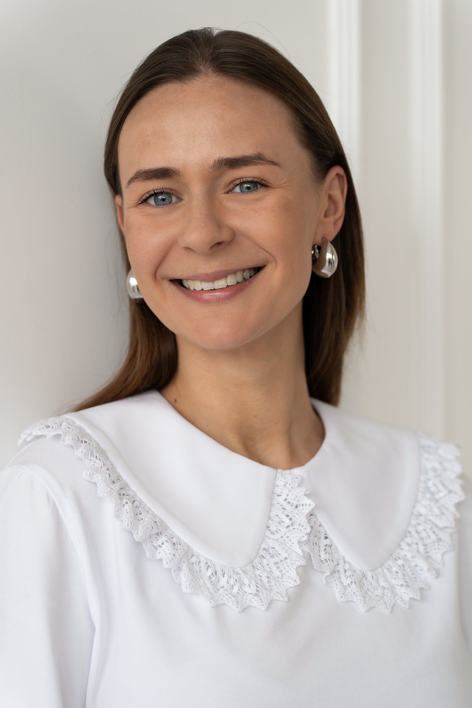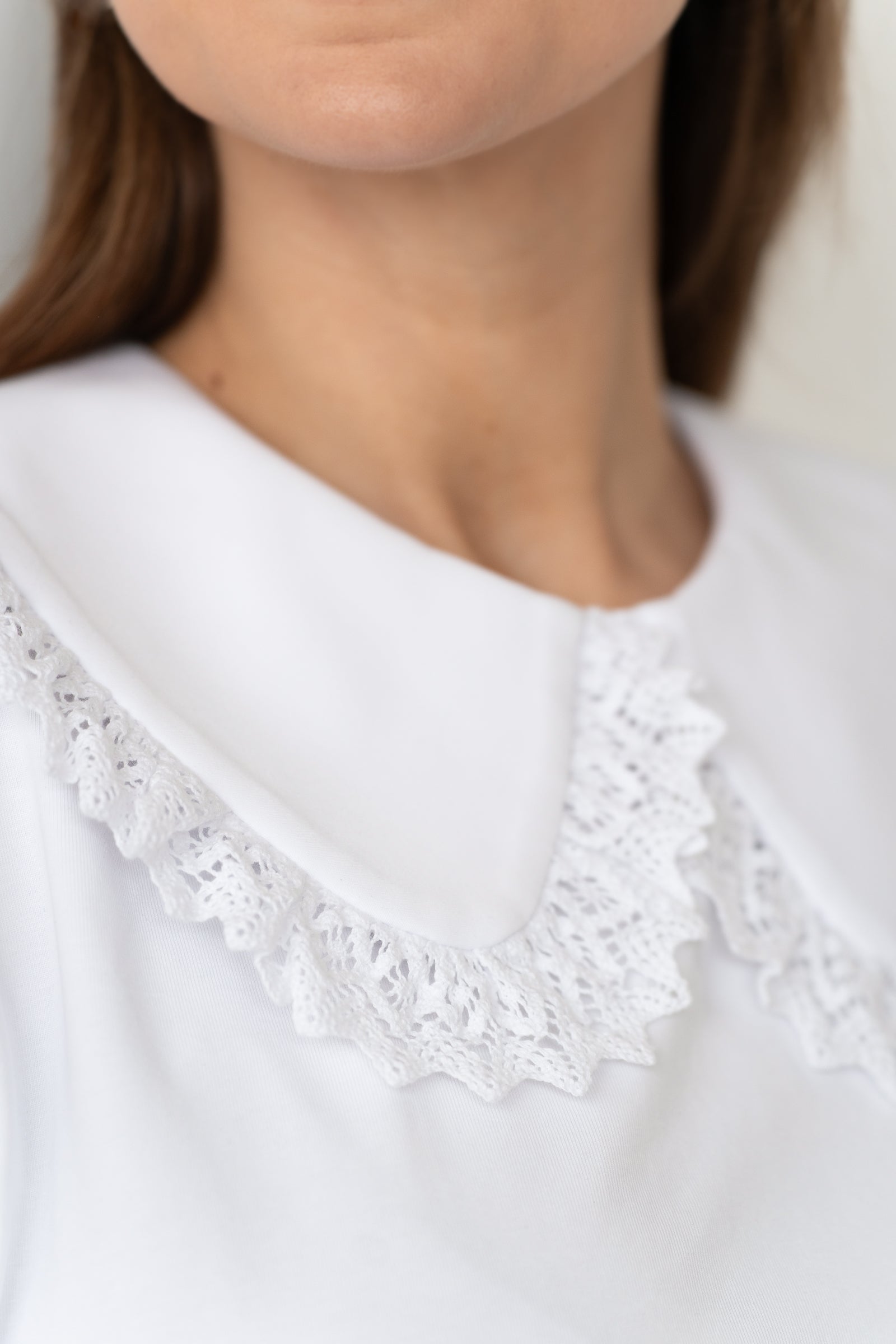 Klasikinė apykaklė su nėrinuku suteiks nesenstančios elegancijos pojūtį (nėrinukas gali skirtis nuo esančio nuotraukoje dėl limituoto leidimo).